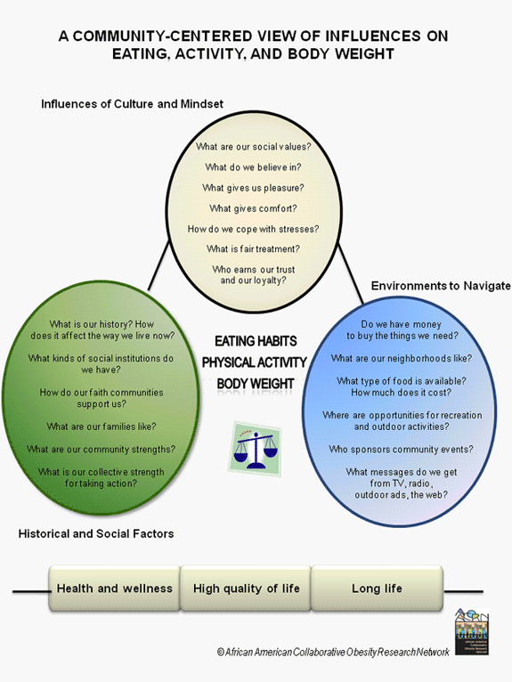 Similar to AACORN's research paradigm, this diagram was developed with a particular focus on African American communities. However, the concepts and the graphic have potential applicability to diverse communities. This model is geared to a collective or group perspective, i.e., what are the behaviors 'on average' or that tend to be the most common. The 'our' and 'we' references in the questions assume that those engaged in the discussion identify as having something in common in a way that makes them participants in the same community. This could be a geographical community (neighborhood), but not necessarily so. This approach recognizes that individuals within the community have a lot of variation in what they eat, how active they are, or whether they are overweight, but focuses on the issue that improvements on these fronts are needed to foster health and wellness and, therefore, high quality of life and longevity.